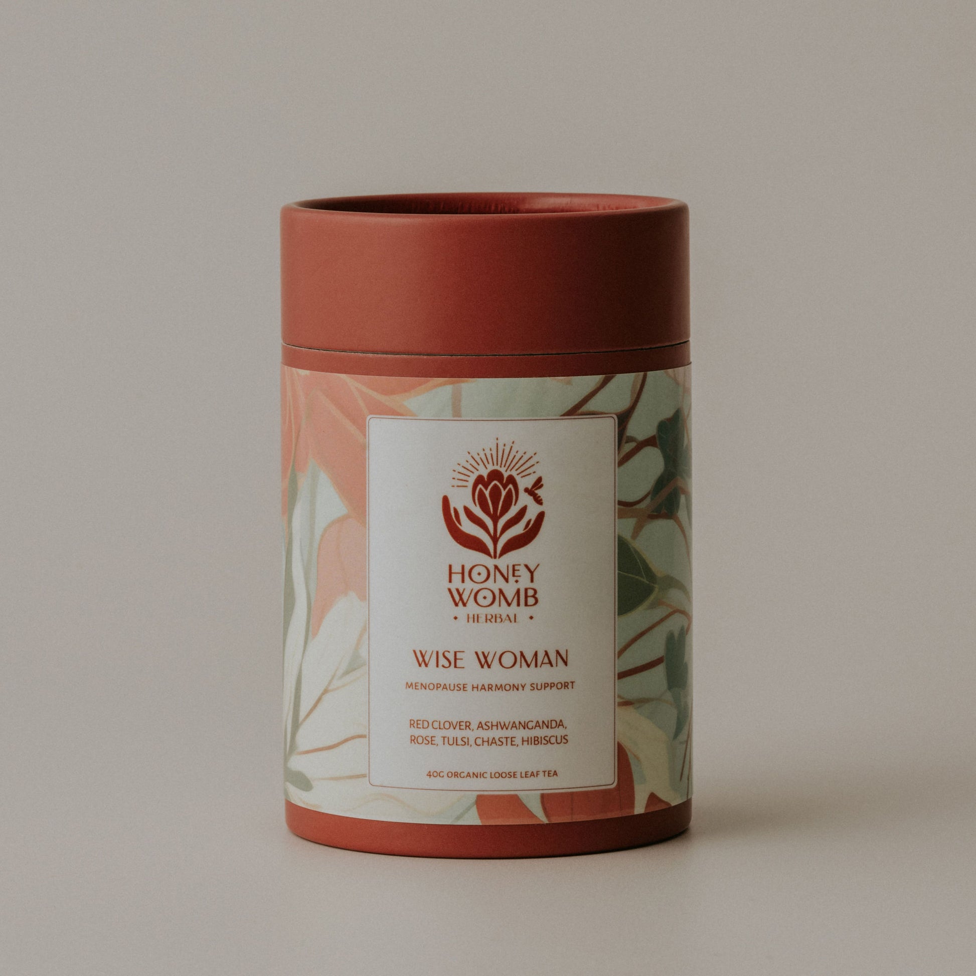 red clover, tulsi, rose lemon balm, calendula, chaste, ashwaganda, spearmint, hibiscus
